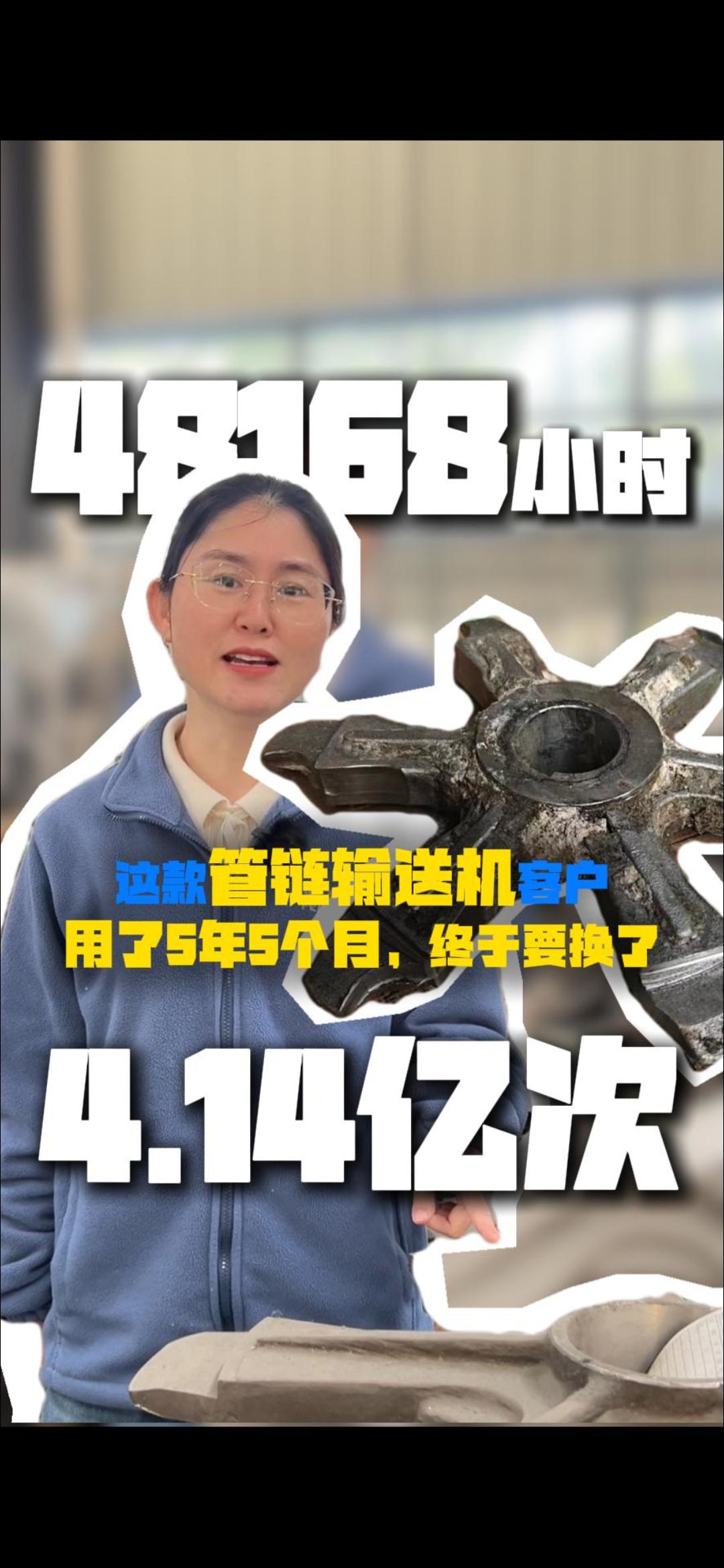 近日,弗格森机械输送(常州)有限公司收到客户反馈,客户拟更换其使用我司研发的管链输送机的链轮部件。沟通后得知,该枚链轮自2020年9月投入运行以来,始终保持24小时不间断运转(行业内同类易损件常规使用寿命仅为6-12个月),而该枚链轮至今已稳定服役5年5个月,仍可正常满足生产需求。48168个小时,4.14亿次运转 ▼作为管链输送机核心传动部件,链轮的稳定性与耐用性直接决定了输送设备的运行效率和使